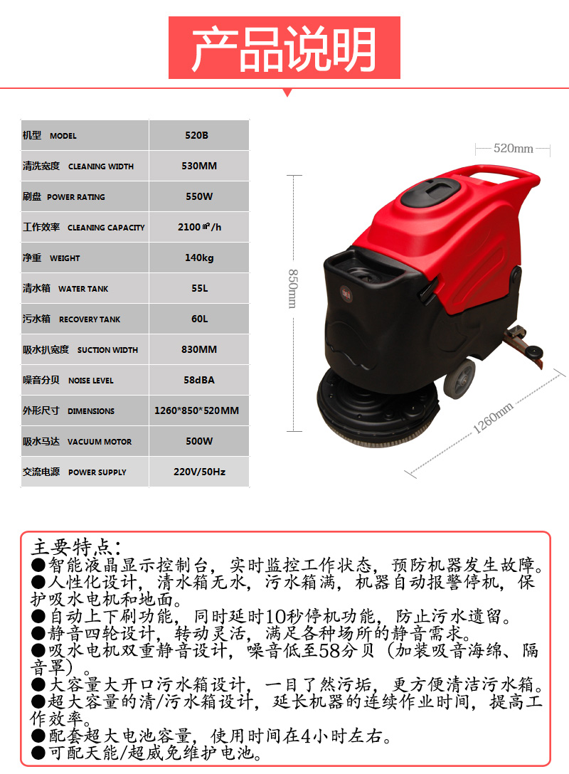520B智能静音型洗地机是一款噪音低、清洁效率高、容量大的清洁产品。适用于百货公司、工厂、地下停车厂医院等6000-8000平方米大面积区域清洁。